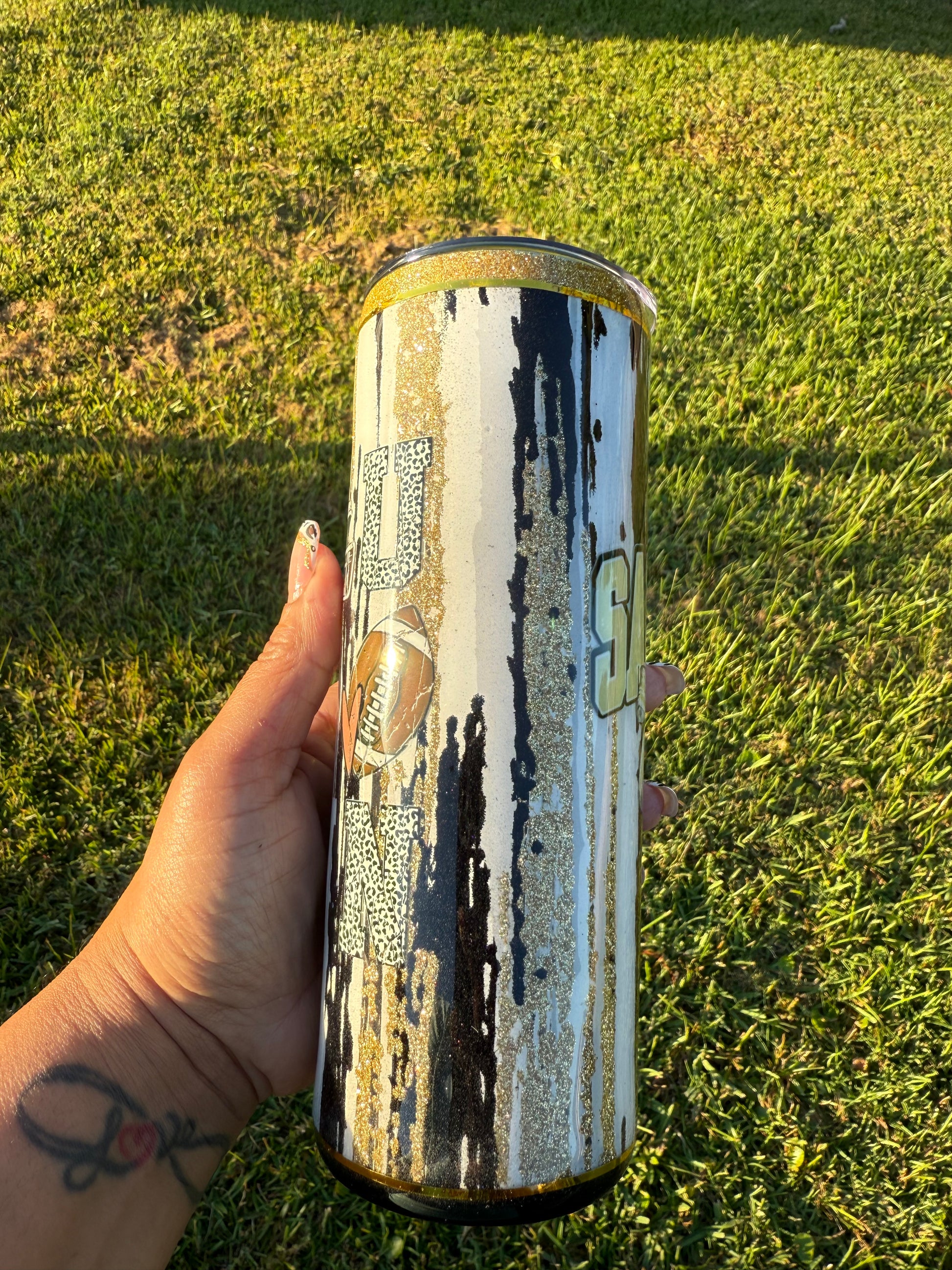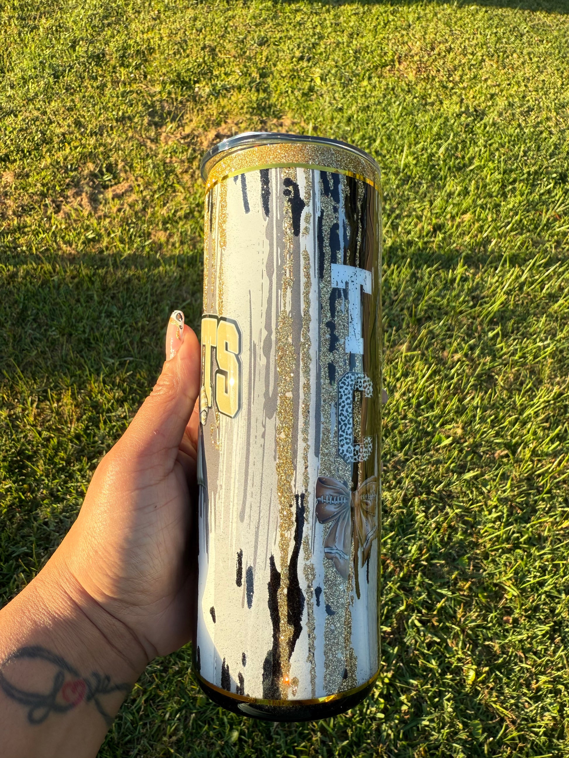 Celebrate every touchdown in style with this 20oz Black and Gold Glitter Tumbler! Featuring playful “Touch Down” lettering, chic bows, and a nod to the Saints, it’s perfect for game day or any day you want to sparkle. Keep your drinks cold or hot while showing off your team spirit with a fun and festive twist.