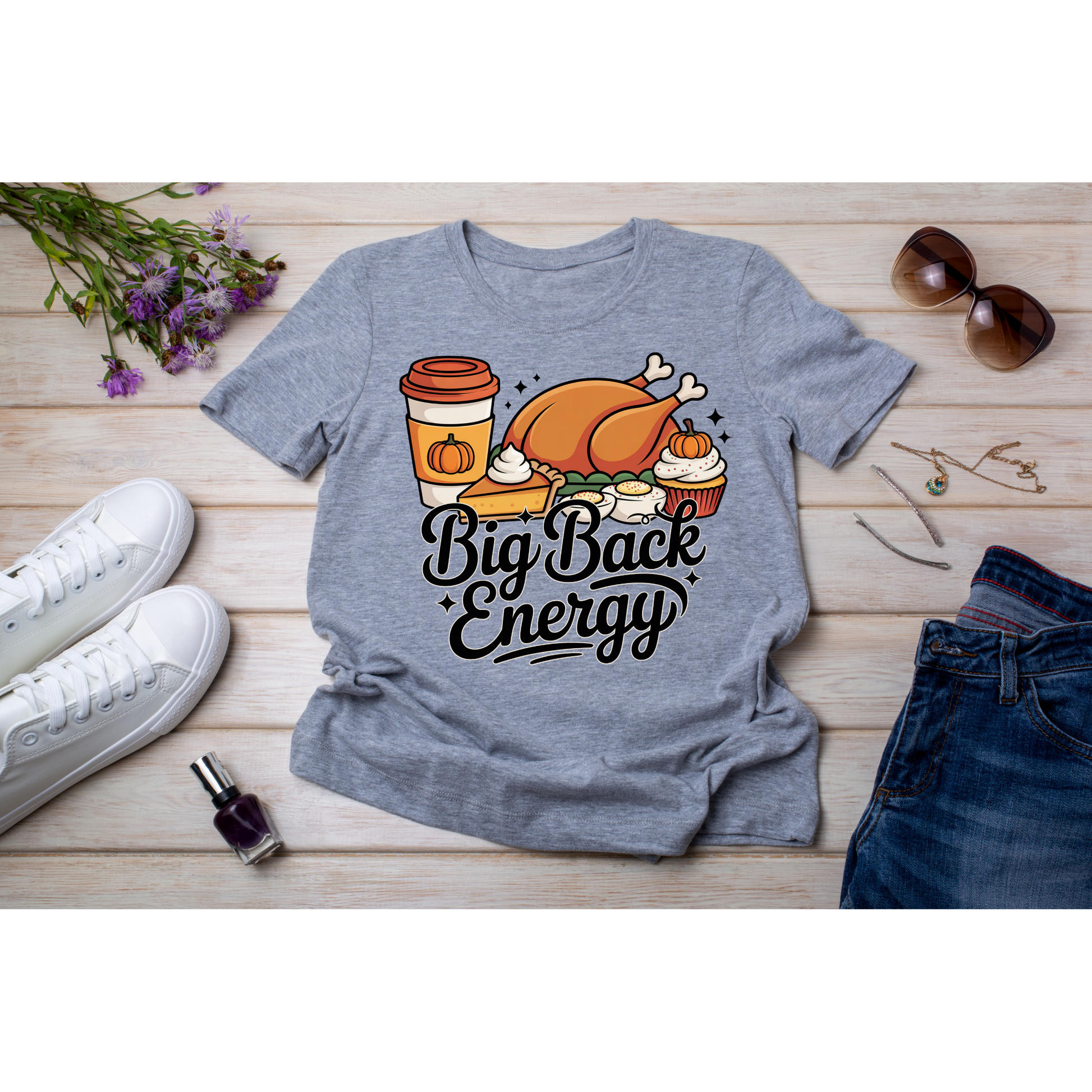 Celebrate the season with this bold Thanksgiving tee that commands attention. "Big Back Energy" delivers confident style perfect for holiday gatherings, family dinners, or casual autumn wear. Crafted for comfort and durability, this shirt pairs effortlessly with jeans or casual pants for a look that works from the kitchen to the couch. Ideal for anyone who appreciates witty, statement-making apparel that captures the spirit of gratitude with attitude.