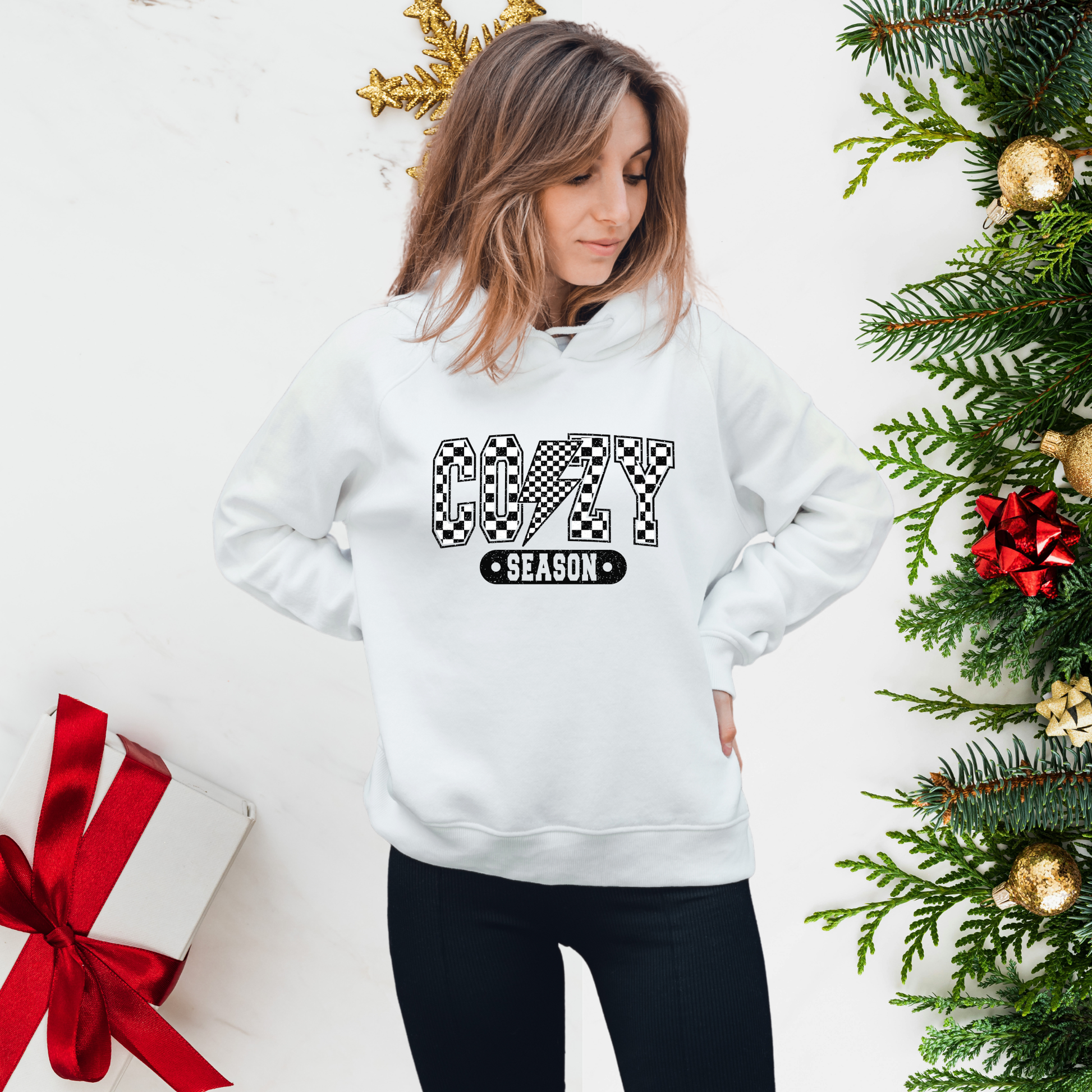 Wrap yourself in comfort with this playful Cozy Season hoodie, featuring bold black and white checkered lettering that brings a fun, retro vibe to your wardrobe. Perfect for chilly days when you want to stay cozy without sacrificing style, this piece pairs effortlessly with jeans, joggers, or loungewear. Whether you're settling in for a movie night or running errands, this hoodie keeps you warm while making a statement. A must-have for anyone who loves mixing comfort with personality.