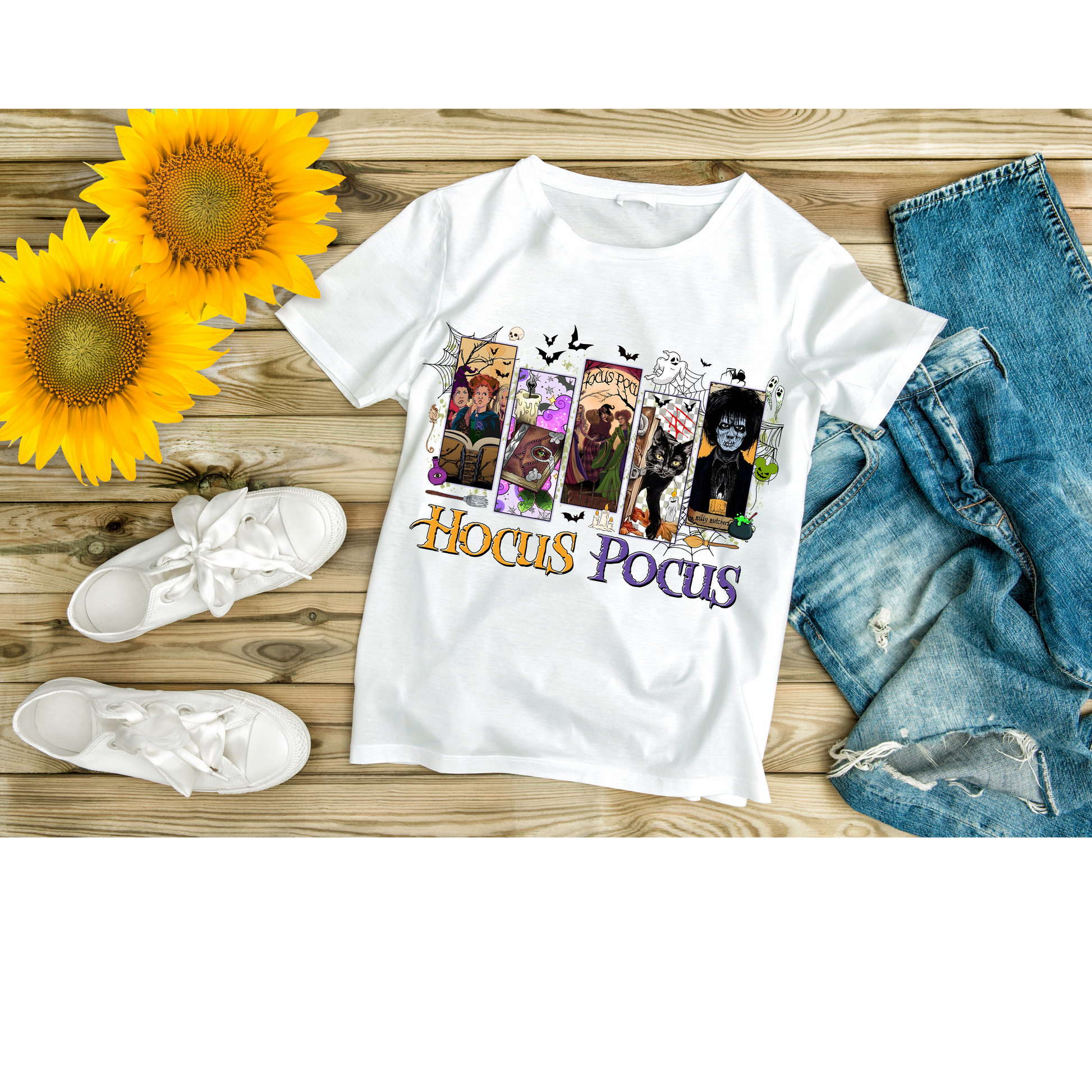 Celebrate your favorite magical trio with the Hocus Pocus - All Characters T-shirt. Featuring all the beloved witches in a playful design, this tee brings spooky fun and charm to your wardrobe. Perfect for fans who want to add a little enchantment and personality to their everyday style.